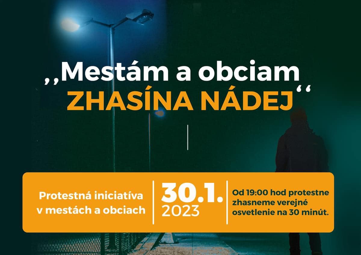 Vážení obyvatelia, pripájame sa k celoslovenskej iniciatíve „Mestám a obciam zhasína nádej,“ podľa ktorej dňa 30. januára 2023, v čase od 19:00 hod. do 19:30 hod. demonštratívne zhasneme časť verejného osvetlenia a dáme tak najavo, že situácia s neriešením cien energií pre samosprávy má mimoriadne vážne a negatívne dopady na plnenie mnohých našich základných úloh a povinností, čo sa dotkne aj bežného života každého z nás. Mestá a obce nie sú autormi problémov. Sú obeťami zlých rozhodnutí vlády a to, čo v tomto období najviac potrebujeme, je rýchla a efektívna pomoc od vlády.